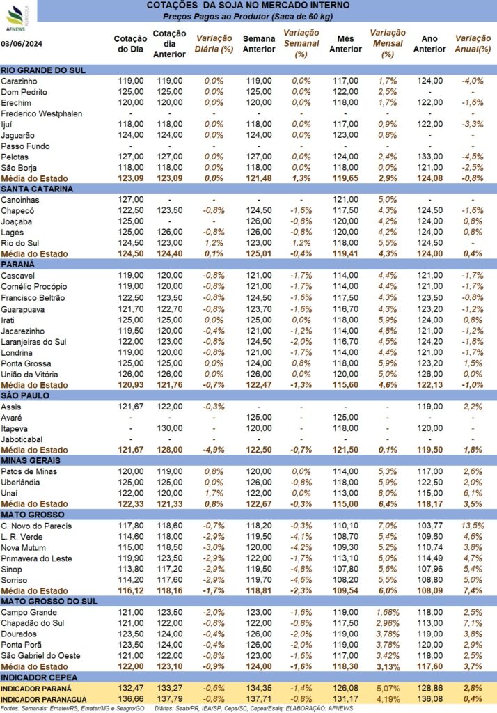 Para o Mato Grosso, a queda foi ainda mais significativa, com a média do estado variado -1,7%, e a soja sendo negociada a R$ 116,12.
