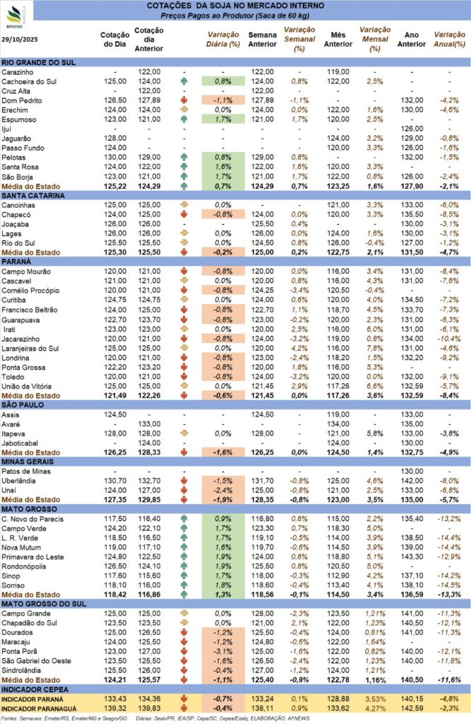 No cenário doméstico, os preços da soja voltaram a recuar. O Indicador Esalq/B3 (Cepea) registrou queda nas principais praças. Em Paranaguá (PR), a saca foi cotada a R$ 139,32, redução de 0,4% em relação ao pregão anterior. No Paraná, o recuo foi de 0,7%, com fechamento a R$ 133,43 por saca.