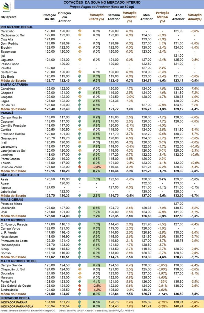 No mercado físico, a maior parte das praças acompanhou o movimento de valorização. No Rio Grande do Sul, a saca foi cotada em média a R$ 122,77, enquanto em Santa Catarina, as cotações giraram em torno de R$ 123,40. Em Minas Gerais, o preço médio foi de R$ 125,50, e no Mato Grosso do Sul, a oleaginosa foi comercializada por cerca de R$ 124,50 por saca.