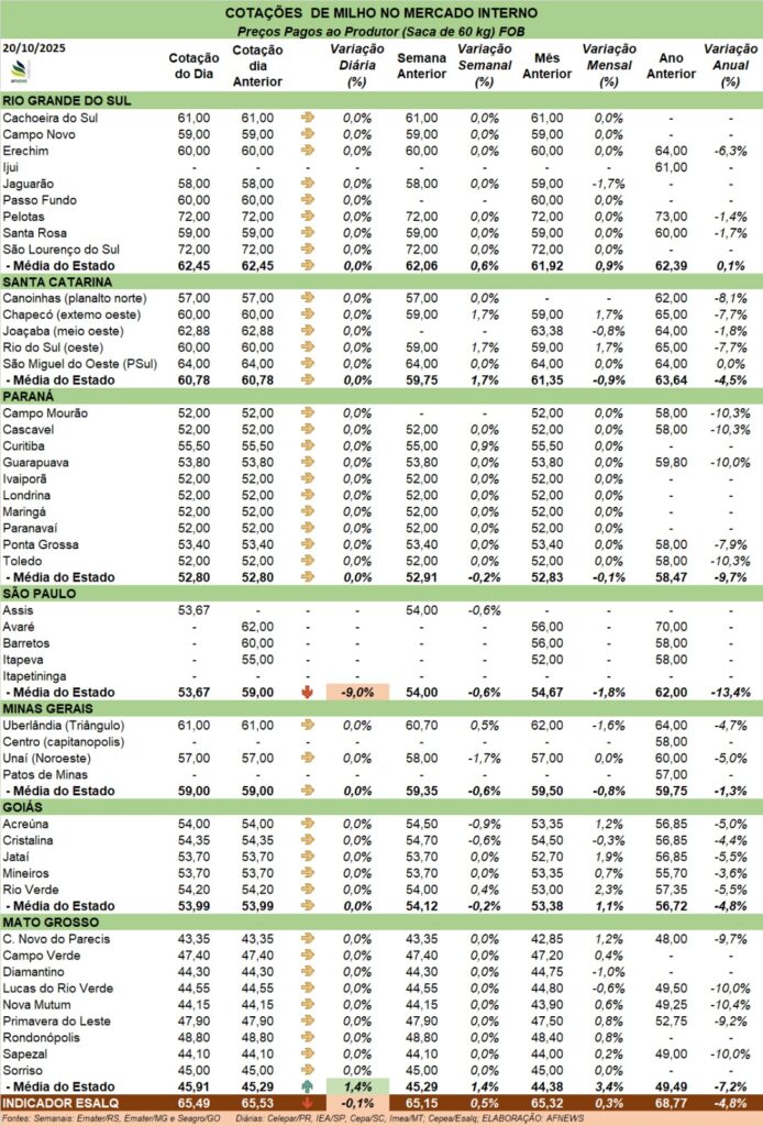 O Indicador Esalq/B3 (Cepea), referência para Campinas (SP), registrou leve recuo de 0,1%, finalizando o dia em R$ 65,49 por saca. No mercado físico, as médias estaduais permaneceram praticamente inalteradas: R$ 62,45 no Rio Grande do Sul, R$ 52,80 no Paraná e R$ 53,99 em Goiás. No Mato Grosso, contudo, observou-se avanço de 1,4%, com o preço médio atingindo R$ 45,91 por saca.