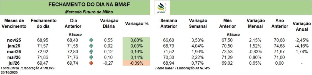 Conforme levantamento da Companhia Nacional de Abastecimento (Conab), até 19 de outubro, 33,2% da área prevista para o plantio do milho no país já havia sido semeada. Em Minas Gerais, as atividades ocorrem de forma pontual, acompanhando o ritmo das precipitações. No Rio Grande do Sul, o plantio avança nas regiões de cultivo tardio, favorecido pelas condições climáticas que têm garantido bom desenvolvimento vegetativo.