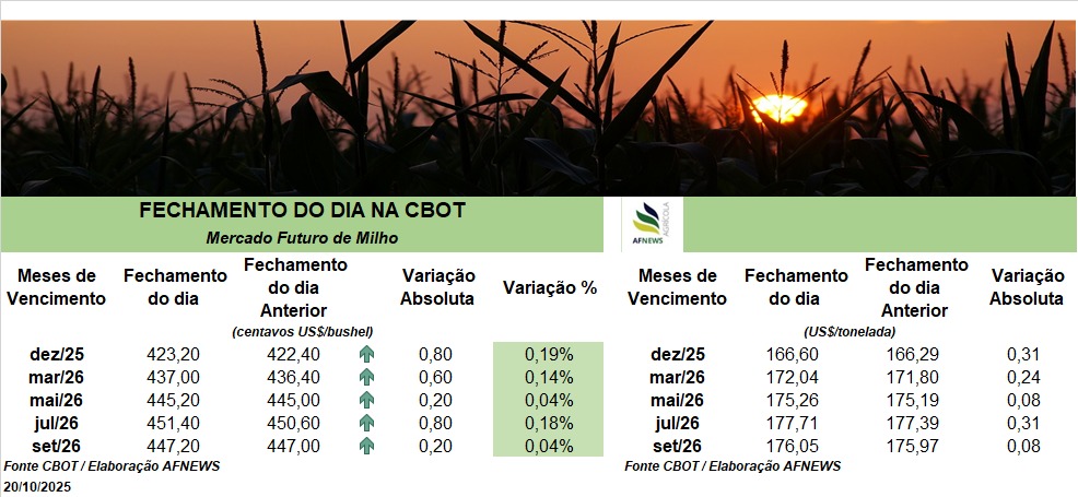 Os contratos futuros de milho iniciaram a semana com leve valorização na Bolsa de Chicago (CBOT). Na segunda-feira (20), o vencimento de dezembro registrou avanço de 0,19%, encerrando a sessão a US$ 4,23 por bushel, enquanto o contrato para março apresentou ganho de 0,14%, cotado a US$ 4,37 por bushel.