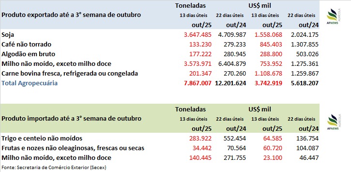 De acordo com dados da Secretaria de Comércio Exterior (Secex), até a terceira semana de outubro (13 dias úteis), as exportações brasileiras de milho totalizaram 3,57 milhões de toneladas, volume correspondente a 55,8% do embarcado em outubro de 2024, quando foram exportadas 6,40 milhões de toneladas ao longo de 22 dias úteis.