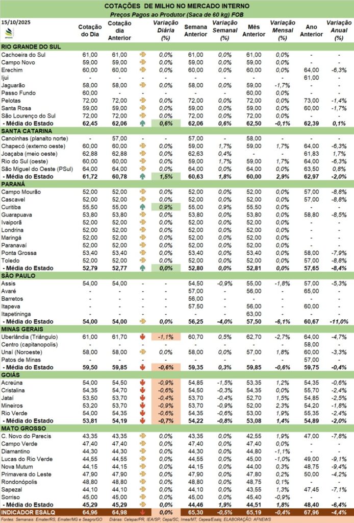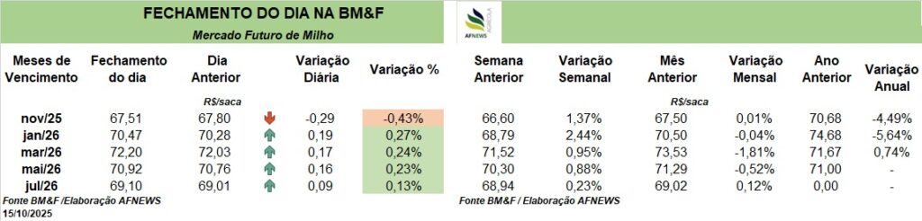 No mercado doméstico, as cotações do milho apresentaram comportamento misto entre os principais contratos futuros da B3. O vencimento de novembro encerrou o pregão a R$ 67,51/saca, representando queda de 0,43% frente ao dia anterior, enquanto o contrato de janeiro registrou elevação de 0,27%, cotado a R$ 70,47/saca.