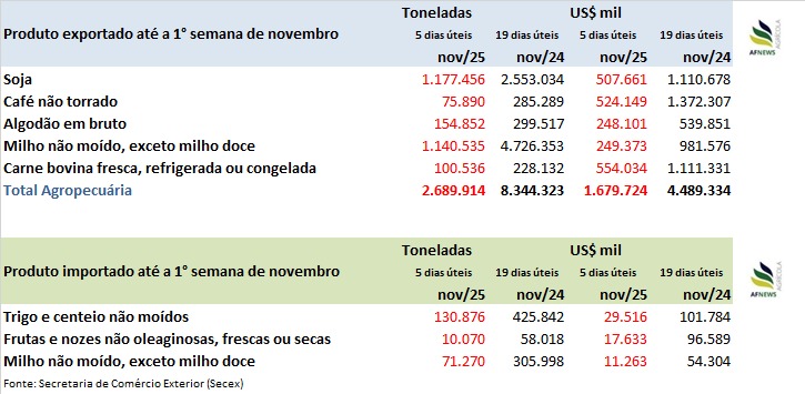 De acordo com a Secretaria de Comércio Exterior (Secex), na primeira semana de novembro (cinco dias úteis), o Brasil embarcou 1,14 milhão de toneladas de milho, volume equivalente a 24,1% do total exportado em novembro de 2024 (4,72 milhões de toneladas em 19 dias úteis).
