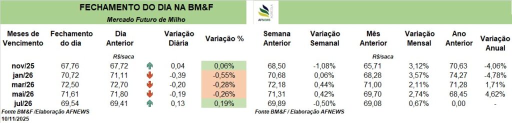 Os contratos futuros de milho iniciaram a semana em alta na Bolsa de Chicago (CBOT). Na segunda-feira (10), o vencimento de dezembro avançou 0,56%, encerrando o pregão a US$ 4,29 por bushel. O contrato de março seguiu a mesma direção, com valorização de 0,54%, negociado a US$ 4,44 por bushel.