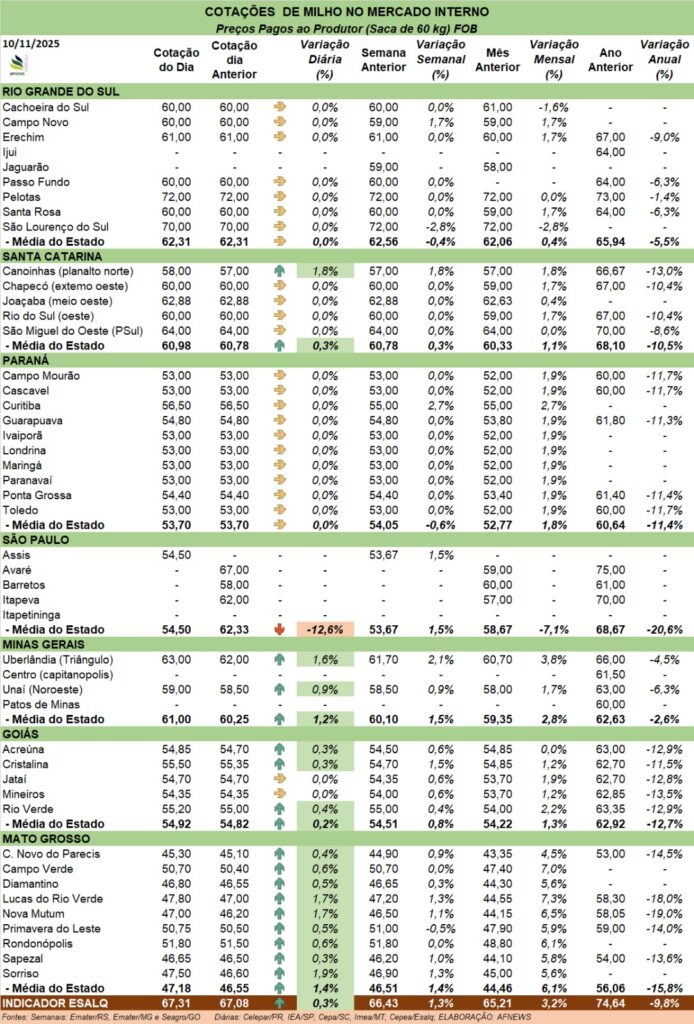 O Indicador Esalq/B3 (Cepea), referência para Campinas (SP), avançou 0,3%, registrando R$ 67,31 por saca. No mercado físico, a maior parte das praças apresentou elevação nos preços médios, com destaque para Mato Grosso (+1,4%; R$ 47,18/saca), Minas Gerais (+1,2%; R$ 61,00/saca) e Santa Catarina (+0,3%; R$ 60,98/saca).