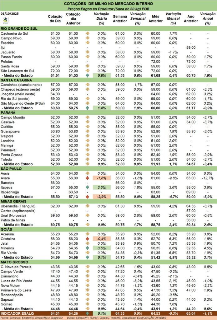 O Indicador Esalq/B3 (Cepea), baseado em Campinas (SP), manteve-se praticamente estável, com leve acréscimo de 0,1%, a R$ 64,31/saca. No mercado físico, houve variações regionais: em Santa Catarina, a média avançou 1,4%, alcançando R$ 60,60/saca; no Rio Grande do Sul, a alta foi de 0,6%, chegando a R$ 61,91/saca; em São Paulo, houve queda de 2,9%, com a saca cotada a R$ 55,50; já no Paraná, não houve alterações, permanecendo em R$ 52,80/saca.