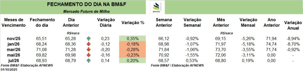 Na quarta-feira (01), os contratos futuros de milho negociados na Bolsa de Chicago (CBOT) encerraram a sessão com ganhos moderados. O vencimento de dezembro registrou alta de 0,24%, cotado a US$ 4,16 por bushel, enquanto o contrato de março avançou 0,14%, finalizando a US$ 4,32 por bushel.