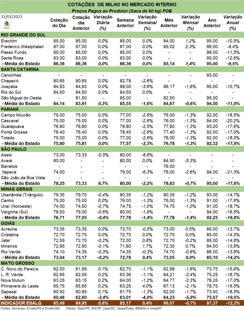 Mais ao Sul, também contamos com atualização do relatório da Deral no Paraná, onde, de acordo com o departamento, o plantio da 2° safra de milho chegou a 3% do total. Com relação a colheita da 1° safra, esta alcançou 1% do total. As lavouras encontram-se 80% em boas condições, 17% médias e apenas 3% em condições ruins.