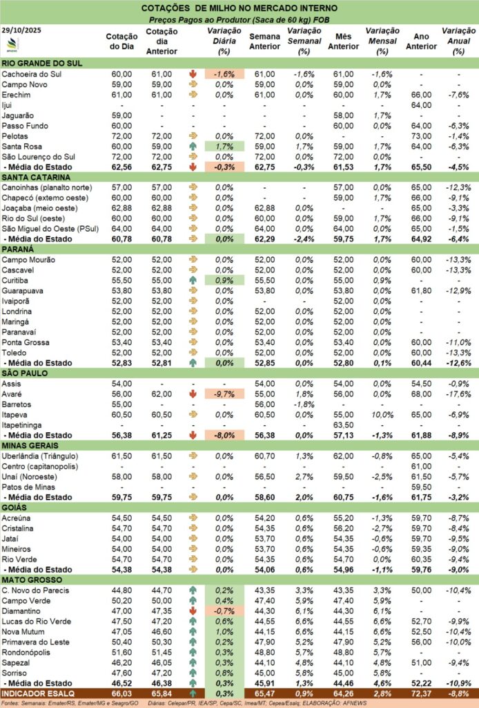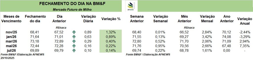 No cenário doméstico, os preços do milho avançaram entre os principais contratos da B3. O vencimento de novembro encerrou o pregão cotado a R$ 68,41 por saca, valorização de 1,32% em relação à sessão anterior, enquanto o contrato de janeiro subiu 0,89%, para R$ 71,64 por saca.