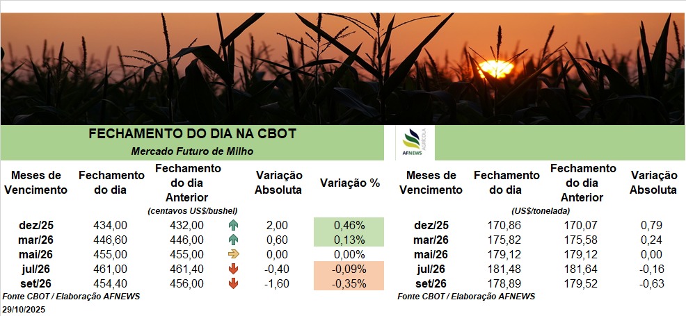 Os contratos futuros de milho na Bolsa de Chicago (CBOT) encerraram a quarta-feira (29) em movimento misto. O vencimento de dezembro apresentou elevação de 0,46%, finalizando a sessão a US$ 4,34 por bushel, enquanto o contrato de março subiu 0,13%, cotado a US$ 4,46 por bushel. Já os vencimentos de maio permaneceram estáveis, ao passo que os de julho e setembro recuaram levemente.