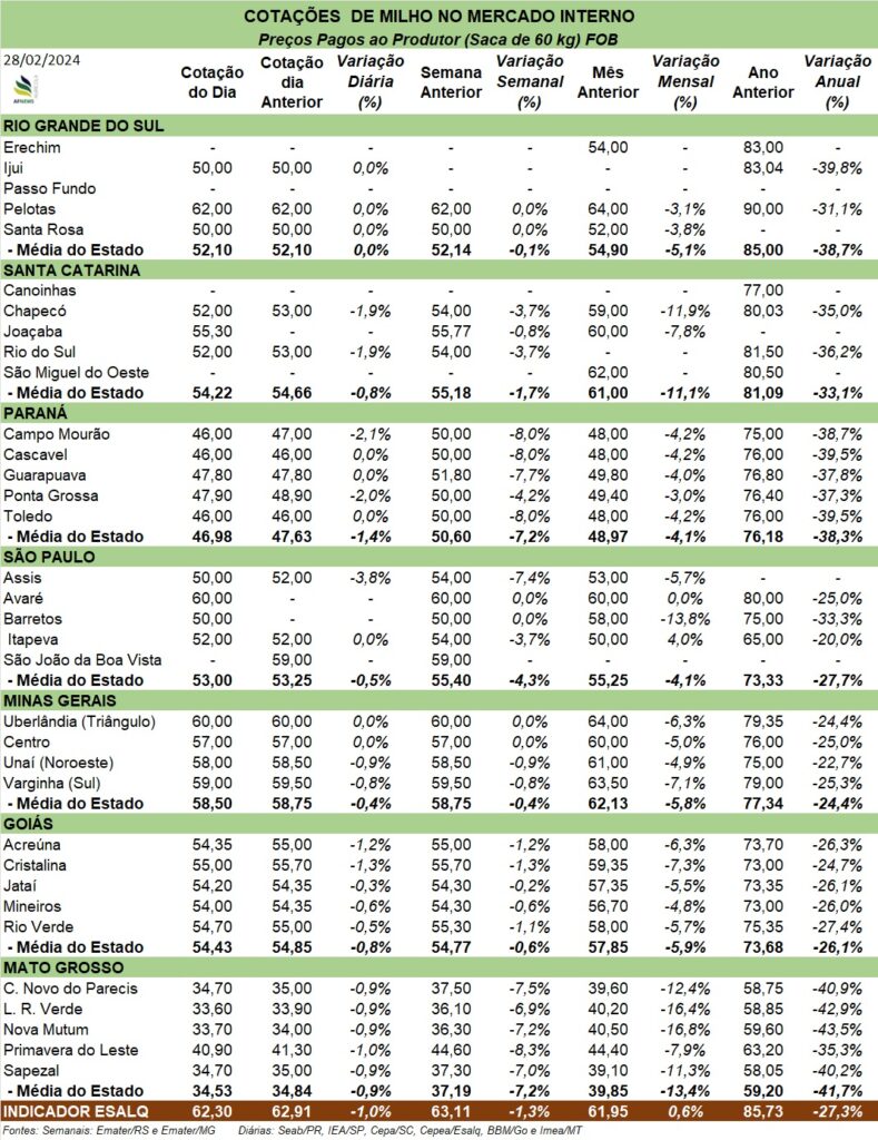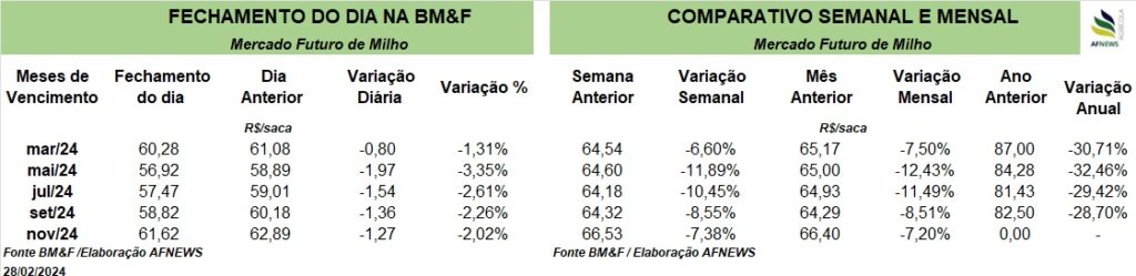 Atuando como suporte, entre os dias 16 e 22 de fevereiro foram vendidas 1,082 milhões de toneladas de milho 2023/24, uma alta de 32% ante a semana anterior.