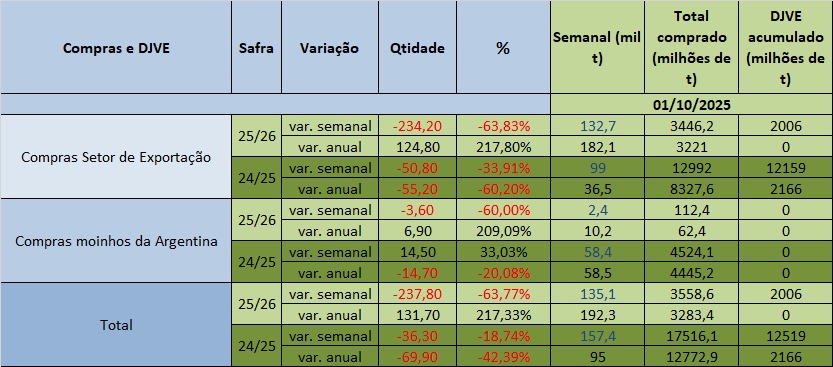 No acumulado do ano safra 25/26, foram comercializadas 3,446 milhões de toneladas de trigo para o mercado externo, sendo que não foram declaradas para exportação (DJVE).