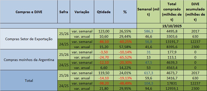 No acumulado do ano safra 24/25, foram comercializadas 13,191 milhões de toneladas de trigo para o mercado externo, sendo que foram declaradas para exportação (DJVE) 12,237 milhões de toneladas.