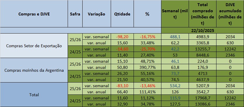As negociações semanais para exportação do trigo da safra 2025/26 totalizaram 488,1 mil toneladas, um recuo de 16,75% ante a semana anterior, quando foram vendidas 586,3 mil toneladas.