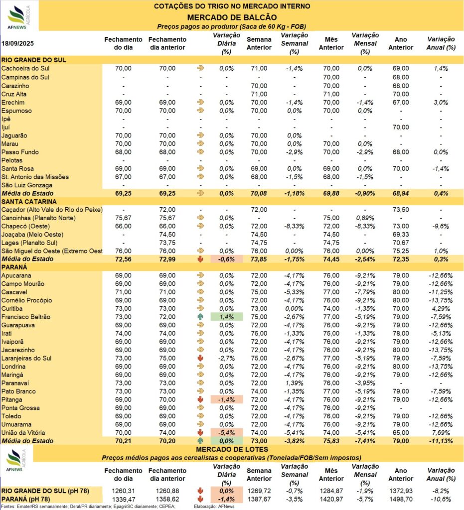 Nesta quinta-feira (18), o mercado brasileiro de trigo permaneceu sob forte pressão, refletindo tanto o avanço das importações quanto a menor liquidez no cenário doméstico. O indicador Cepea/Esalq apontou no Paraná o preço de R$ 1.339,47 por tonelada para o trigo pão ou melhorador, recuo de 1,4% em relação ao dia anterior. No Rio Grande do Sul, o trigo brando apresentou estabilidade, sendo negociado a R$ 1.260,31/tonelada.