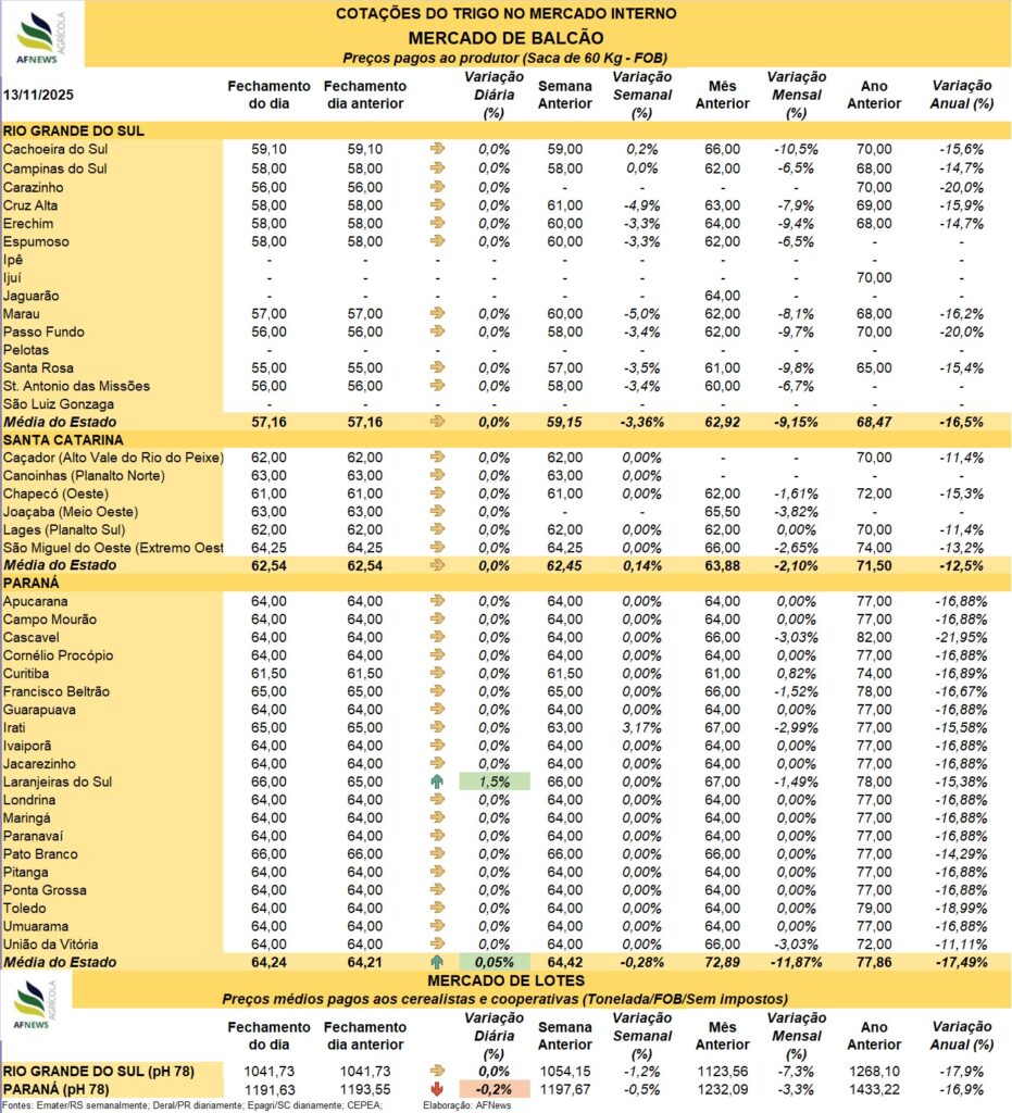 O mercado brasileiro de trigo encerrou a quinta-feira (13) com um quadro predominantemente estável. Segundo o Indicador Cepea/Esalq, o trigo pão ou melhorador no Paraná foi negociado a R$ 1.191,63 por tonelada, ligeiro recuo de 0,2% frente ao pregão anterior. No Rio Grande do Sul, o trigo brando permaneceu estático, cotado a R$ 1.041,73 por tonelada.