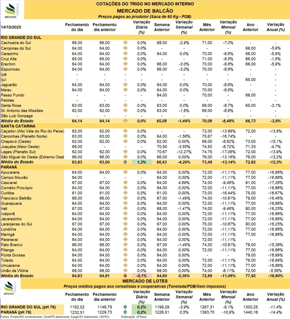 No mercado físico, as cotações permaneceram praticamente estáveis, com exceção de Santa Catarina, onde o preço médio da saca de 60 kg registrou elevação de 1,2%, atingindo R$ 63,83. No Rio Grande do Sul, a média foi de R$ 64,14/saca, sem variações significativas, enquanto no Paraná houve leve retração de 0,1%, para R$ 64,83/saca.