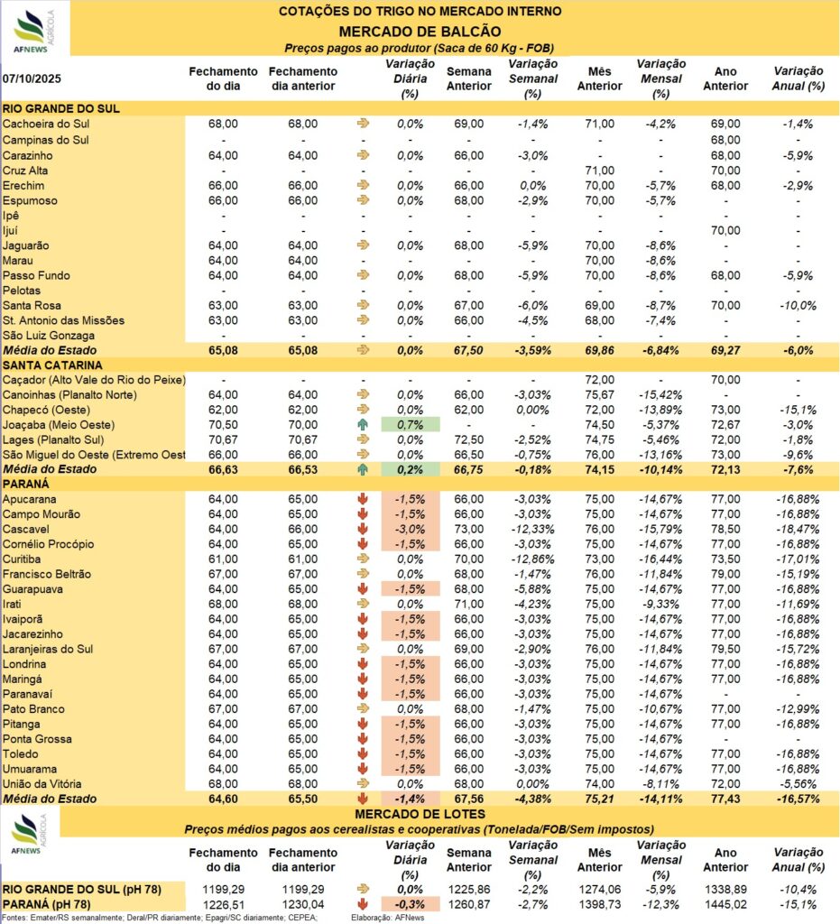 O mercado interno de trigo voltou a registrar desvalorizações nesta terça-feira (07), refletindo a combinação de fatores internos e externos que mantêm o setor sob forte pressão. De acordo com o indicador Cepea/Esalq, o trigo pão ou melhorador no Paraná foi cotado a R$ 1.226,51 por tonelada, representando recuo de 0,3% em relação à sessão anterior. No Rio Grande do Sul, o trigo brando manteve-se estável, negociado a R$ 1.199,29 por tonelada.