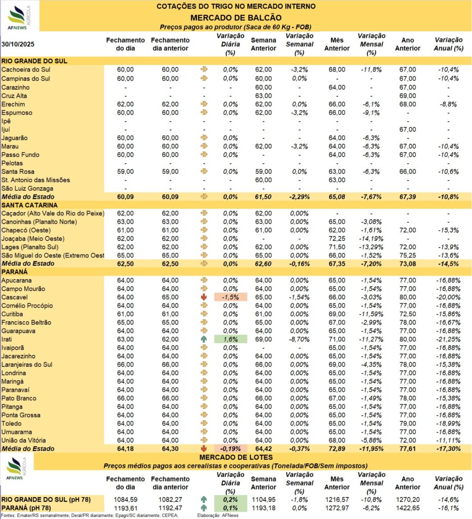O mercado doméstico de trigo encerrou a quinta-feira (30) em ambiente de estabilidade, apenas com incrementos marginais. Conforme o indicador Cepea/Esalq, o trigo pão ou melhorador no Paraná foi negociado a R$ 1.193,61 por tonelada, registrando leve acréscimo de 0,1% em relação ao pregão anterior. No Rio Grande do Sul, o trigo brando teve valorização moderada de 0,2%, alcançando R$ 1.084,59 por tonelada.