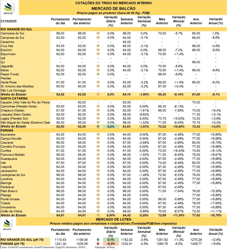 O mercado brasileiro de trigo apresentou estabilidade nesta terça-feira (21), registrando apenas variações marginais nas cotações. Segundo o indicador Cepea/Esalq, o trigo pão ou melhorador no Paraná foi negociado a R$ 1.201,30 por tonelada, queda de 0,3% frente à sessão anterior. No Rio Grande do Sul, o trigo brando teve leve avanço de 0,1%, cotado a R$ 1.110,43 por tonelada.