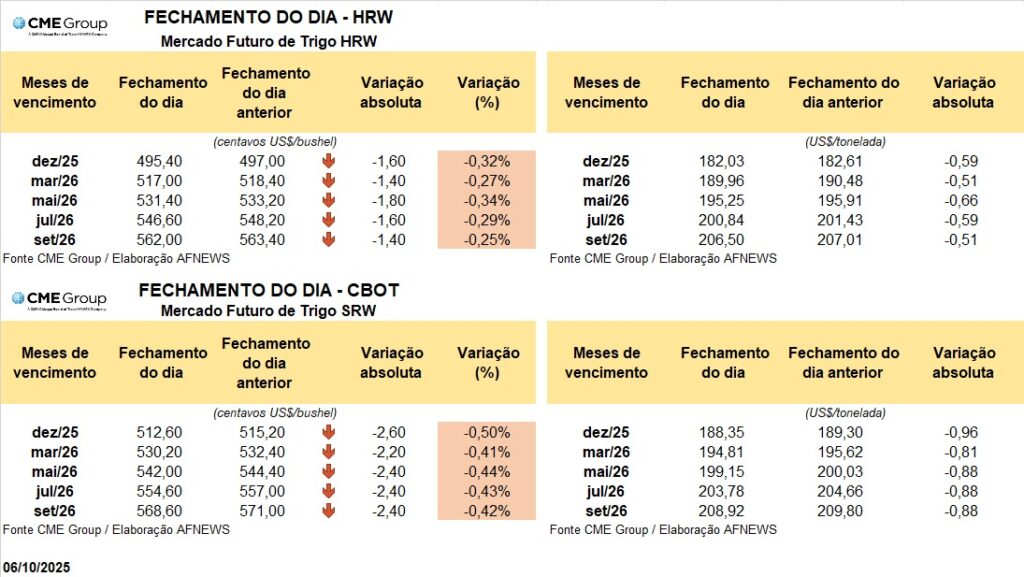 Na Bolsa de Kansas, o trigo do tipo HRW seguiu a mesma tendência baixista. O contrato de dezembro caiu 0,32%, sendo negociado a US$ 4,95 por bushel, e o de março apresentou redução de 0,27%, finalizando a US$ 5,17 por bushel.