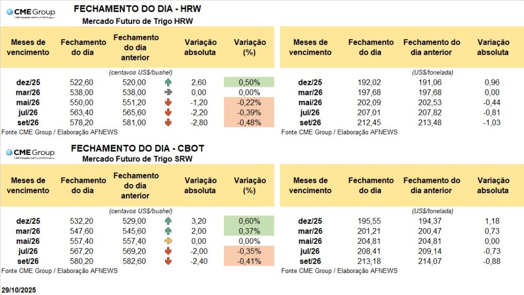 Em Kansas, o trigo tipo HRW com vencimento em dezembro teve valorização de 0,5%, negociado a US$ 5,22 por bushel, ao passo que o contrato de março permaneceu inalterado, cotado a US$ 5,38 por bushel. Os vencimentos de maio, julho e setembro, contudo, registraram quedas.