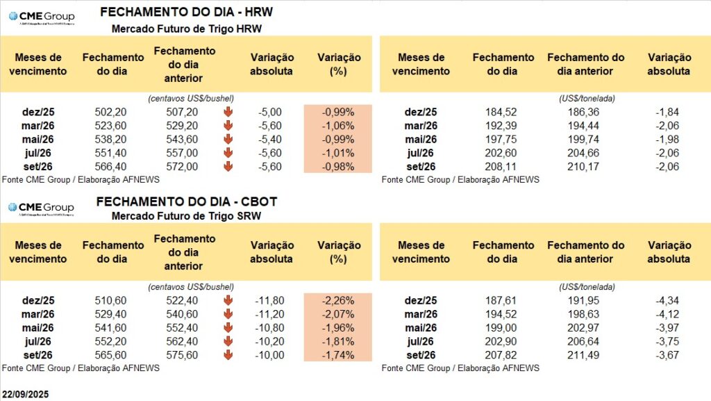 Na Rússia, o Ministério da Agricultura anunciou que a tarifa de exportação de trigo será elevada para 655,6 rublos por tonelada a partir de 24 de setembro, contra 495,9 rublos da semana anterior, um aumento de quase 50%. A base de cálculo considera um preço indicativo de US$ 226/tonelada, enquanto o preço de referência foi mantido em 18.000 rublos/tonelada. O imposto equivale a 70% da diferença entre o preço de referência e o indicativo.