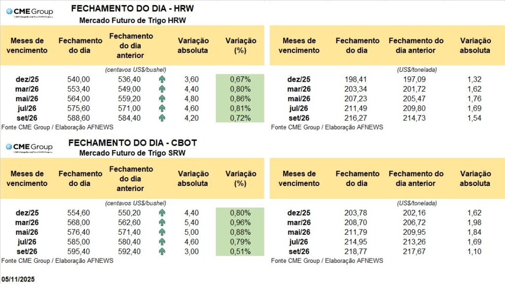 Em Kansas, o mercado de trigo tipo HRW acompanhou o movimento altista. O contrato de dezembro avançou 0,67%, negociado a US$ 5,40 por bushel, ao passo que o vencimento de março subiu 0,8%, atingindo US$ 5,53 por bushel.