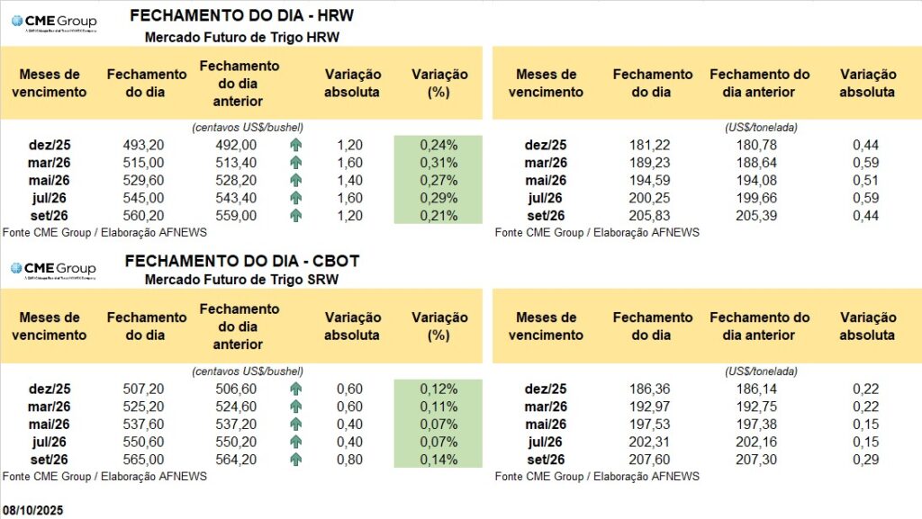 O mercado internacional de trigo encerrou a quarta-feira (08) com leves ganhos nas principais bolsas globais. Na Bolsa de Chicago (CBOT), os contratos futuros do trigo tipo SRW com o vencimento de dezembro avançou 0,12%, encerrando a sessão a US$ 5,07 por bushel, enquanto o contrato de março registrou valorização de 0,11%, cotado a US$ 5,25 por bushel.