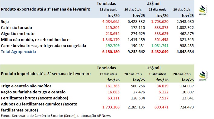 Dados da Secretaria de Comércio Exterior (Secex) revelam que, até a terceira semana de fevereiro (13 dias úteis), o Brasil importou 1,79 milhão de toneladas de adubos ou fertilizantes químicos, volume equivalente a 78,3% do total internalizado em fevereiro de 2025 (2,28 milhões de toneladas). O preço médio alcançou US$ 339,9 por tonelada, avanço de 7,4% na comparação anual. A média diária importada foi de 137,93 mil toneladas, expansão de 20,5% frente a igual período do ano anterior.