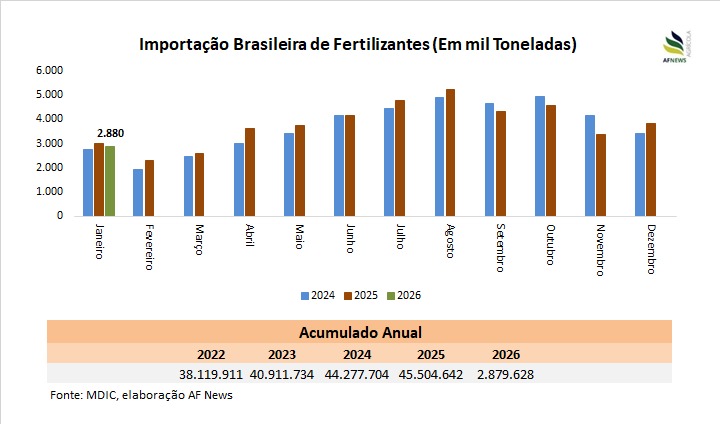 Segundo dados da Secretaria de Comércio Exterior (Secex), no mês de janeiro, as importações totais de fertilizantes somaram 2,879 milhões de toneladas, representando um recuo de 3,7% em relação ao mesmo mês do ano anterior. O preço médio de importação atingiu US$ 325,51 por tonelada, alta de 4,7% na comparação anual, reforçando o fato de que os custos da produção agrícola seguem subindo.