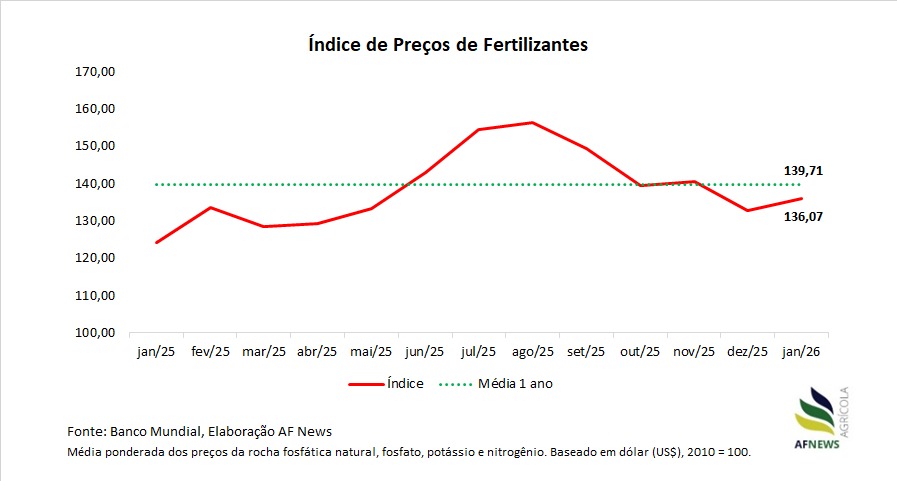 O Índice de Preços dos Fertilizantes do Banco Mundial, calculado a partir de uma média ponderada dos preços internacionais da rocha fosfática natural, fosfatos, potássio e nitrogênio, todos denominados em dólar, alcançou 136,07 pontos em janeiro. O resultado representa elevação de 2,42% frente a dezembro e avanço de 9,48% na comparação com janeiro de 2025. Ainda assim, o índice permanece 2,61% abaixo da média dos últimos 12 meses, estimada em 139,71 pontos.