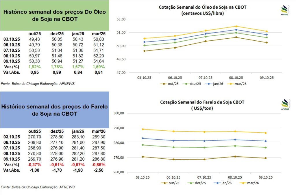 Entre os dias 3 e 9 de outubro, os derivados de soja apresentaram comportamento misto nas principais bolsas internacionais. Na Bolsa de Chicago (CBOT), o óleo de soja encerrou a semana com valorização consistente: o contrato para outubro avançou 1,92%, cotado a US$ 50,38 por libra-peso, enquanto o vencimento de dezembro registrou alta de 1,78%, alcançando US$ 50,94 por libra-peso.