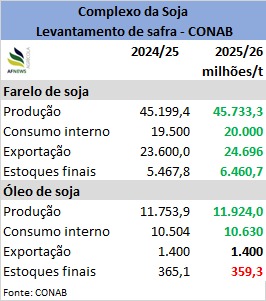 As novas estimativas da Conab para o balanço de oferta e demanda da safra 2025/26 indicam ajustes relevantes na produção e no comércio de derivados de soja. Para o farelo, a autarquia projeta produção nacional de 45,73 milhões de toneladas, volume inferior ao cálculo anterior, mas ainda 1,6% superior ao registrado no ciclo precedente. O consumo doméstico deve alcançar 20 milhões de toneladas, incremento de 2,6% frente à temporada passada e sem alterações em relação à previsão divulgada anteriormente. No campo externo, as exportações foram revisadas para 24,69 milhões de toneladas, avanço anual de 4,6%, embora abaixo da estimativa anterior. Os estoques finais devem atingir 6,46 milhões de toneladas, alta de 18,2% no comparativo anual, mas também com leve redução ante o relatório de outubro.