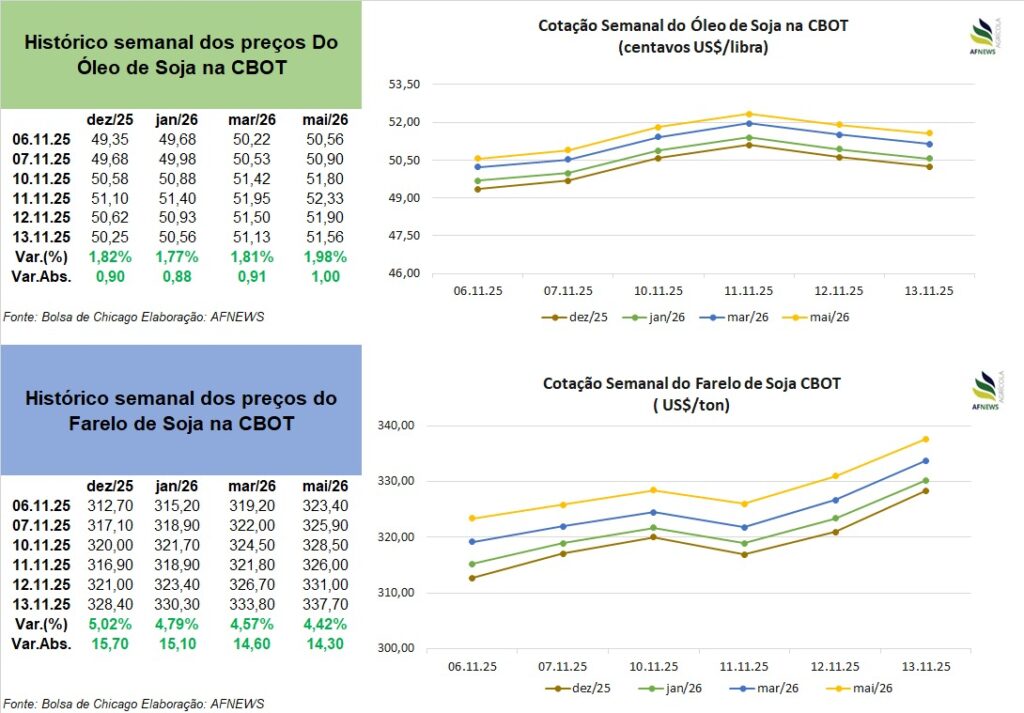 Entre os dias 7 e 13 de novembro, os mercados internacionais de derivados de soja exibiram movimentos predominantemente positivos. Na Bolsa de Chicago (CBOT), o Óleo de soja com contrato para dezembro subiu 1,82% no comparativo semanal, encerrando o dia 13 cotado a US$ 50,25 por libra-peso, enquanto o vencimento de janeiro avançou 1,77%, negociado a US$ 50,96 por libra-peso.