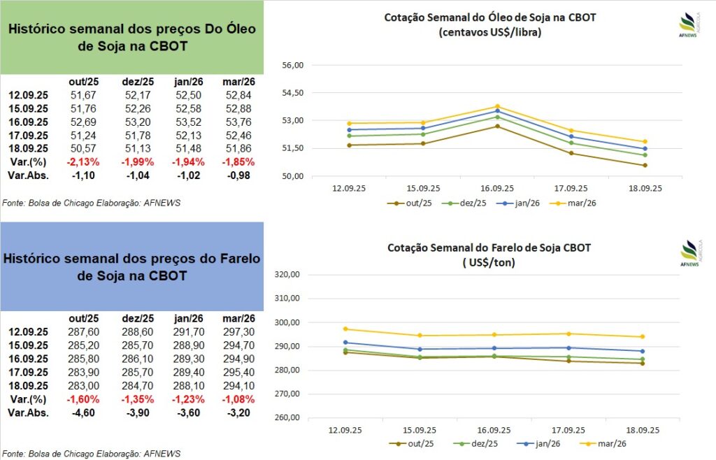 A semana no mercado internacional encerrou com queda nas cotações dos derivados da soja. Entre 12 e 18 de setembro, na Bolsa de Chicago (CBOT), o contrato futuro do óleo de soja para outubro recuou 2,13%, cotado a US$ 50,57/libra-peso. O vencimento de dezembro também apresentou baixa de 1,99%, negociado a US$ 51,13/libra-peso.
