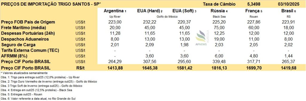 Segundo dados da Secretaria de Comércio Exterior (Secex), até a quinta semana de setembro (22 dias úteis), o Brasil importou 568 mil toneladas de trigo e centeio não moídos, volume 3,8% inferior ao registrado em setembro de 2024, quando foram adquiridas 591 mil toneladas em 21 dias úteis.