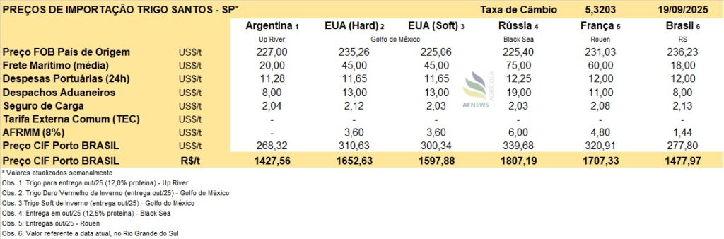 O cereal argentino, que responde pela maior parte da importação brasileira, tornou-se ainda mais atrativo para a importação, com preço CIF no Brasil em torno de R$ 1.427,56 por tonelada.