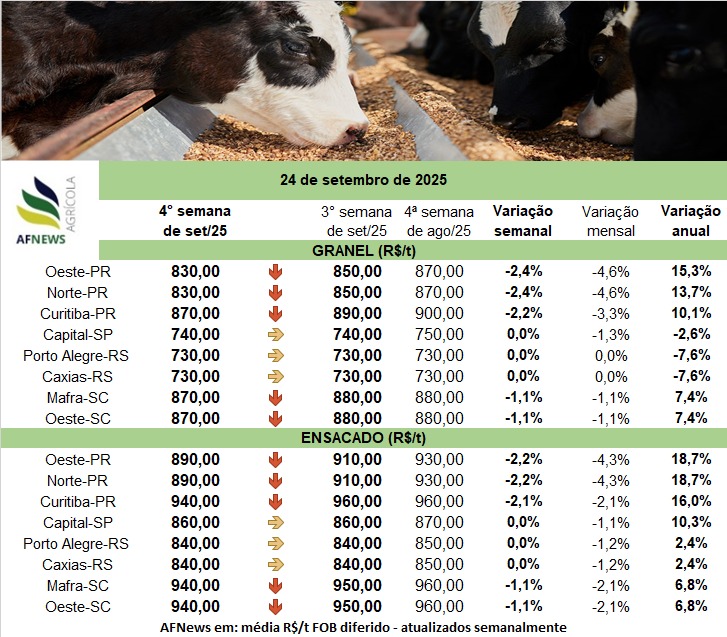Nas demais regiões, a procura por farelo demonstra sinais de recuperação, embora ainda insuficientes para sustentar movimentos consistentes de alta. Os produtos substitutos continuam exercendo pressão sobre as cotações, mas há expectativa de retomada, uma vez que a atratividade dessas alternativas vem diminuindo desde a segunda quinzena de setembro. Com a proximidade de outubro, espera-se uma maior disputa pelo insumo entre indústrias de ração e pecuaristas, o que tende a conferir sustentação altista às cotações.