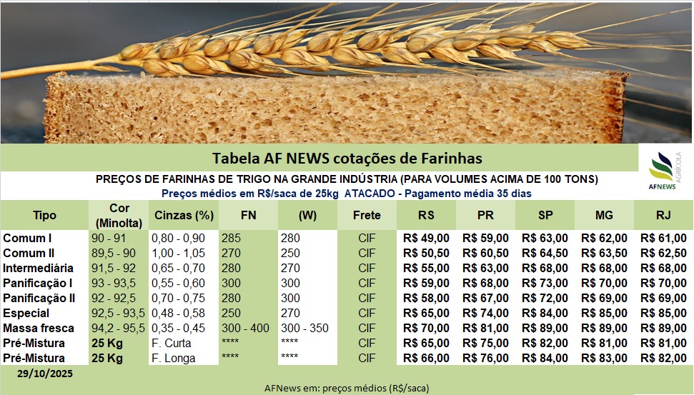 O mercado brasileiro de farinha de trigo segue apresentando comportamento estável nas cotações, com exceção das farinhas especiais, que registraram recuos nas principais praças do país. O ambiente ainda é de pressão sobre os preços, e os agentes do setor demonstram poucas expectativas de recuperação no curto prazo.