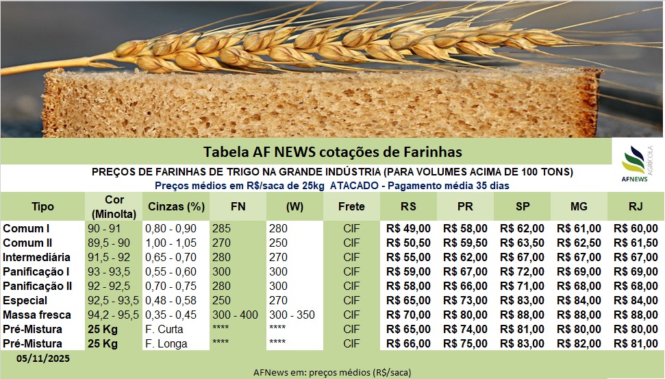 O mercado de farinha de trigo permanece sob forte pressão baixista, com agentes do setor demonstrando pouca confiança em uma recuperação no curto prazo. Na comparação com a semana anterior, as cotações registraram recuos, ainda que modestos, na maior parte das regiões monitoradas, exceto no Rio Grande do Sul. Frente à primeira semana do mês passado, as retrações médias no país alcançam 3% para a farinha tipo comum I, 2,6% para a farinha de panificação e 3,5% nas farinhas especiais.