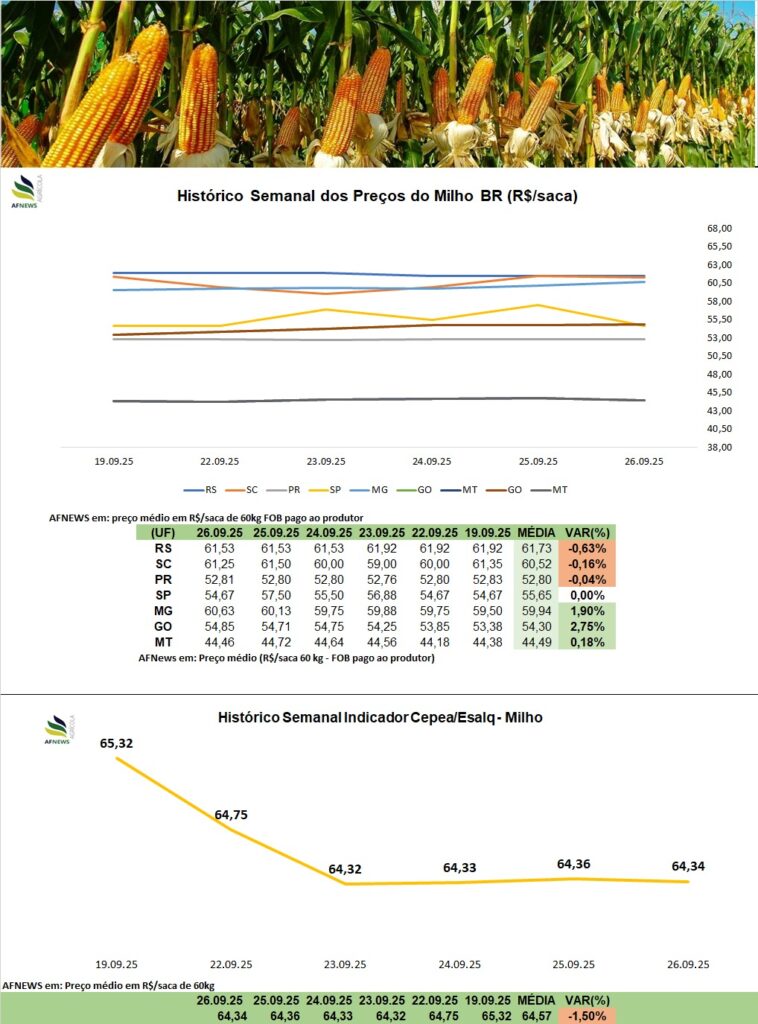 No campo, a Companhia Nacional de Abastecimento (Conab) indica que 20,8% da área projetada para o milho já foi semeada no Brasil. No Rio Grande do Sul, os trabalhos avançam em ritmo acelerado, embora as baixas temperaturas estejam retardando a emergência e o desenvolvimento inicial das lavouras, contudo, sem comprometer o potencial produtivo. De acordo com a Emater/RS, a semeadura já alcança 62% da área prevista no estado.