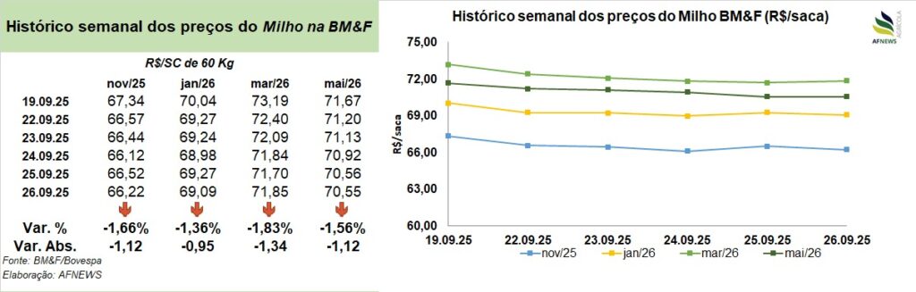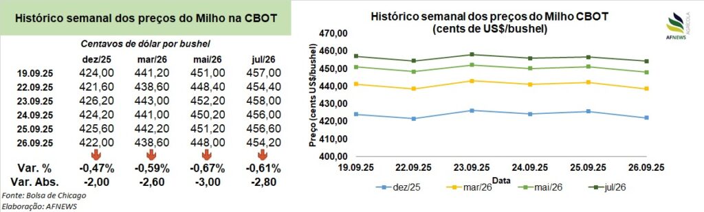 As cotações internacionais do milho registraram nova retração na última semana. Na Bolsa de Chicago (CBOT), nesta sexta-feira (26), o contrato de dezembro recuou 0,47%, cotado a US$ 4,22/bushel, enquanto o vencimento de março acompanhou o movimento, com queda de 0,59% no acumulado semanal, encerrando a US$ 4,38/bushel.