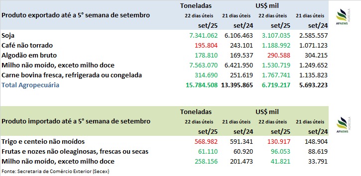 No âmbito externo, dados da Secretaria de Comércio Exterior (Secex) indicam que, até a quinta semana de setembro (22 dias úteis), as exportações somaram 7,56 milhões de toneladas, volume 17,8% superior ao registrado em setembro de 2024 (6,42 milhões em 21 dias úteis).