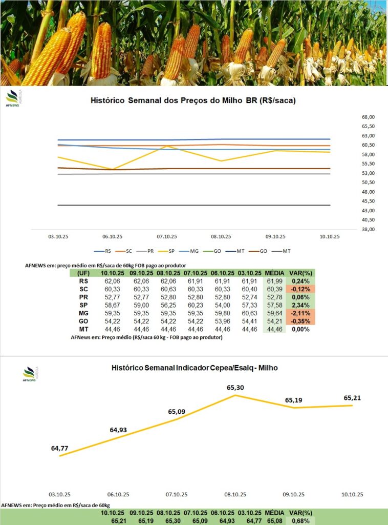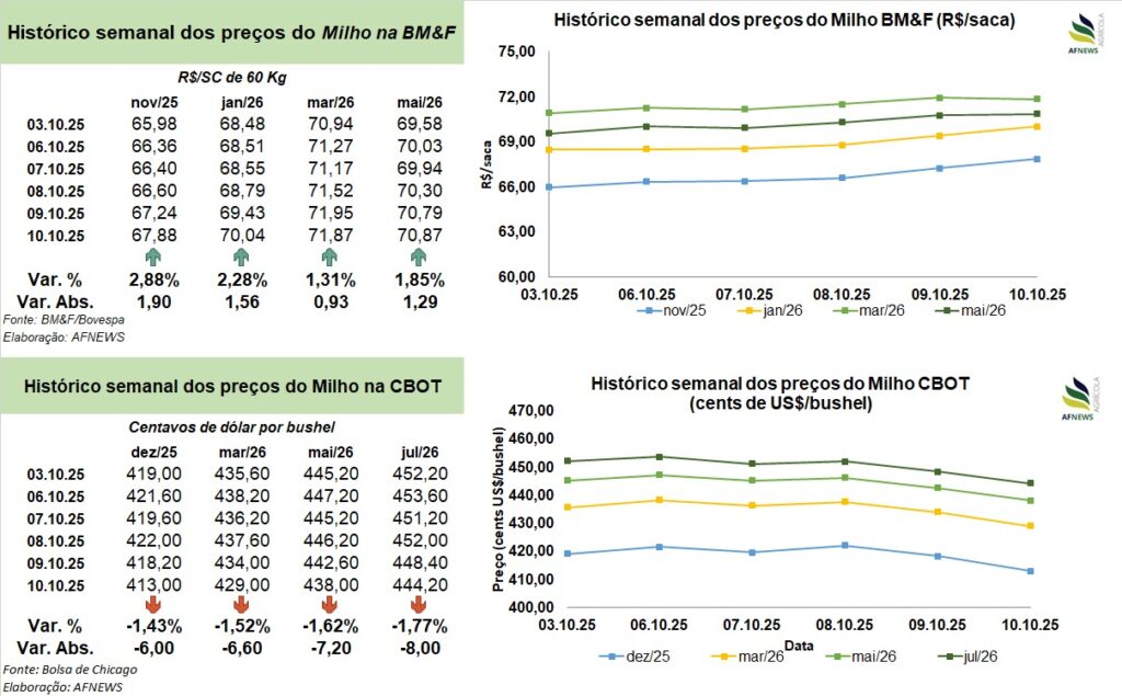 Em contrapartida ao cenário externo, o mercado brasileiro de milho apresentou movimento altista ao longo da semana. Na B3, o contrato para novembro valorizou-se 2,88%, encerrando a R$ 67,88 por saca, enquanto o vencimento de janeiro subiu 2,28%, cotado a R$ 70,04 por saca.