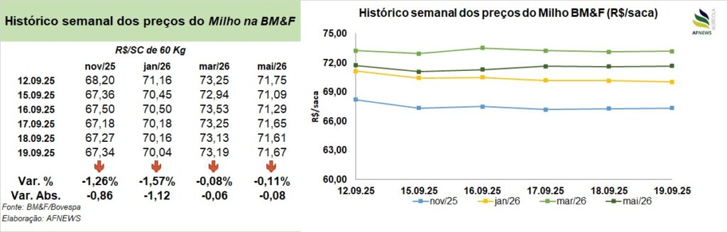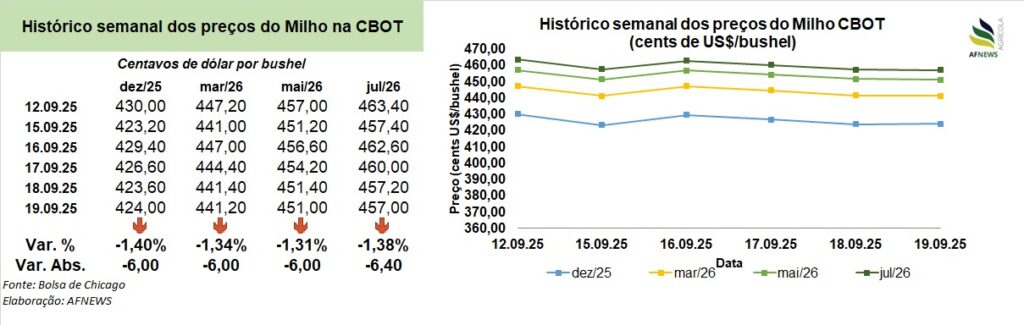 As cotações do milho nos mercados internacionais recuaram em relação à semana anterior. Na Bolsa de Chicago (CBOT), nesta sexta-feira (19), o contrato de dezembro caiu 1,4%, negociado a US$ 4,24/bushel. O vencimento de março também acompanhou o movimento, cedendo 1,34% no comparativo semanal, para US$ 4,41/bushel.
