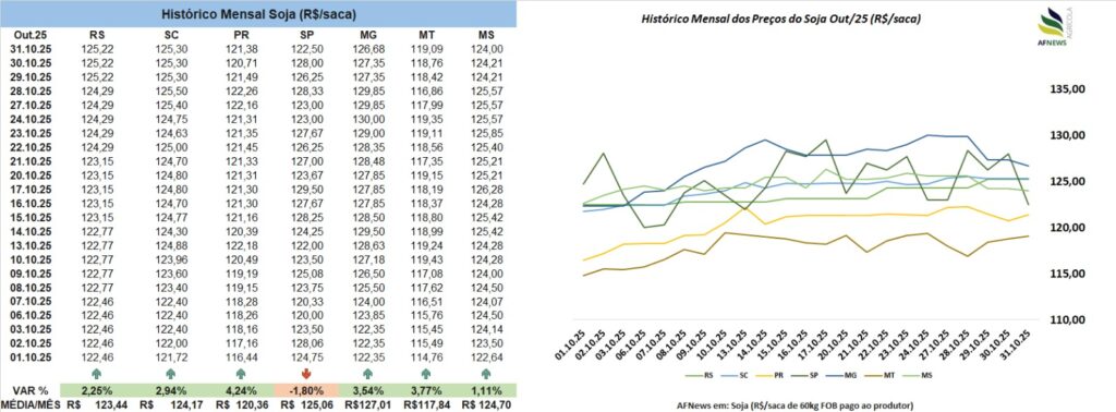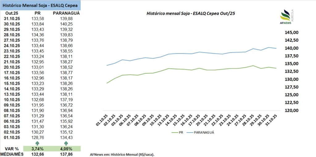 No Brasil, o mercado físico acompanhou a tendência externa de valorização ao longo de outubro. Segundo o Indicador Esalq/B3 do Cepea, a soja em Paranaguá encerrou o mês cotada a R$ 139,88 por saca, avanço de 4,05% no comparativo mensal. No Paraná, a alta foi de 3,74%, com média de R$ 133,58 por saca.