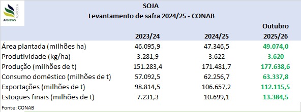 O relatório mais recente da Companhia Nacional de Abastecimento (Conab), com relação a oferta e demanda, projeta produção nacional de soja em 177,6 milhões de toneladas para 2025/26, incremento de 3,6% em comparação à temporada anterior. A área cultivada deve alcançar 49 milhões de hectares, também 3,6% superior ao ciclo passado, enquanto a produtividade média é estimada em 3.260 kg/ha, mantendo-se praticamente estável.